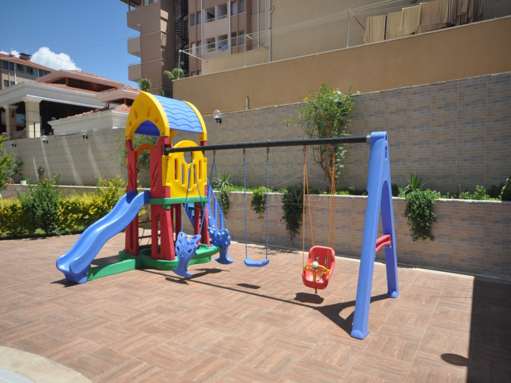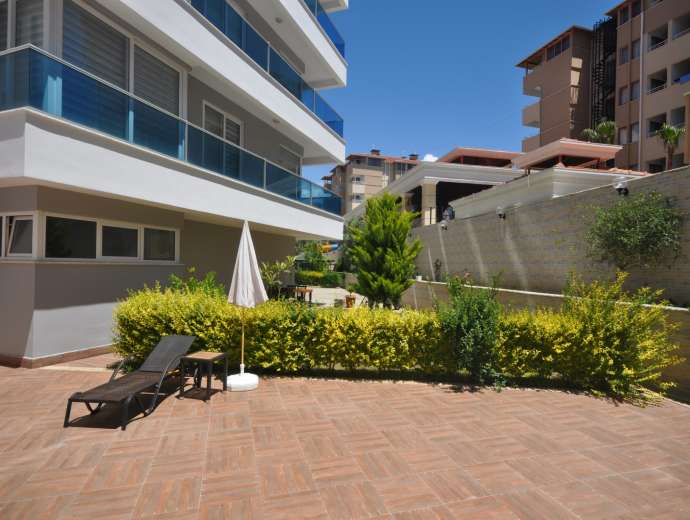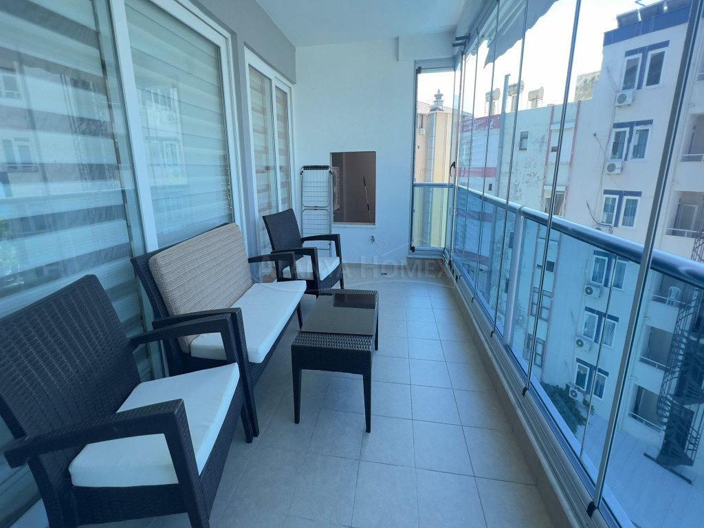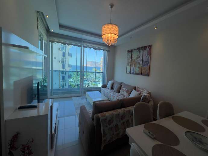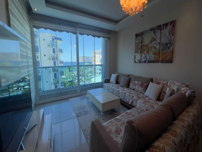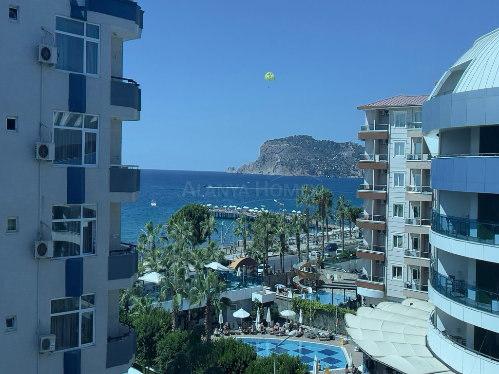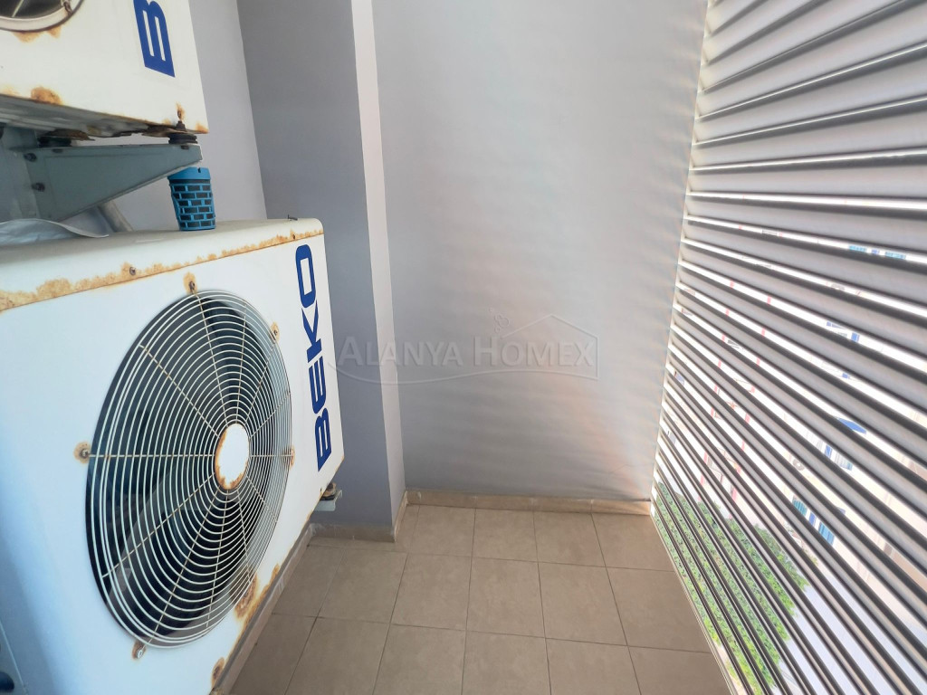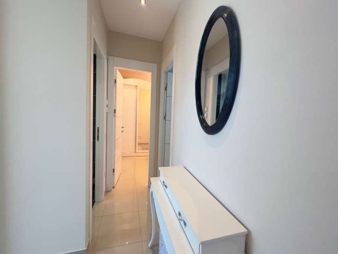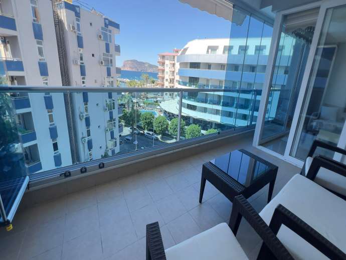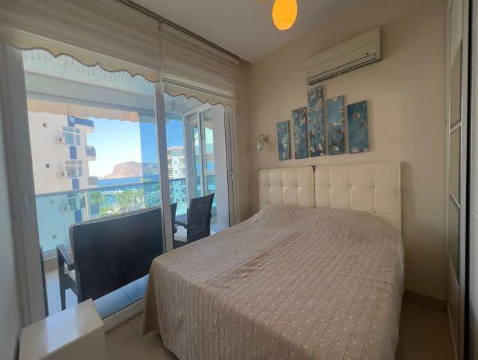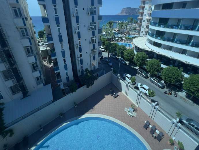 Sie befindet sich im 5. Stock eines 9-stöckigen Gebäudes. Sie ist nach Südwesten ausgerichtet und bietet einen Blick auf das Meer, den Berg Alanya und die Stadt.